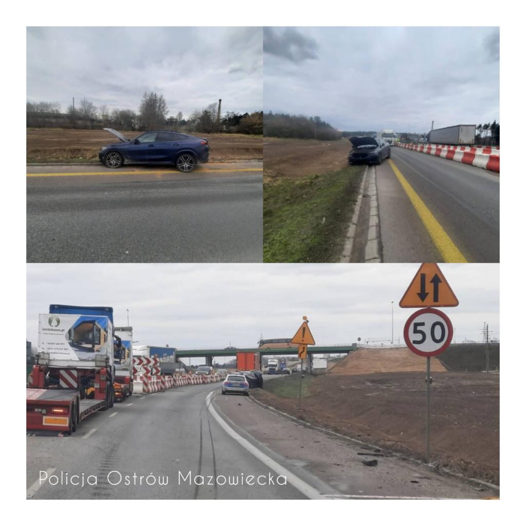 5.04. po południu dyżurny ostrowskiej komendy odebrał zgłoszenie o kolizji drogowej na drodze S-8 w pobliżu Ostrowi Mazowieckiej. Na miejsce pojechał patrol ruchu drogowego. Mundurowi na miejscu ustalili, że 34-letni obywatel Litwy jadąc bmw lewym pasem nie dostosował prędkości do warunków drogowych w wyniku czego uderzył w bariery ochronne. Elementy tych barier uszkodziły ciężarówkę jadącą prawym pasem ruchu, którą kierował 34-letni mieszkaniec woj. podlaskiego, na szczęście mężczyźni nie odnieśli obrażeń.