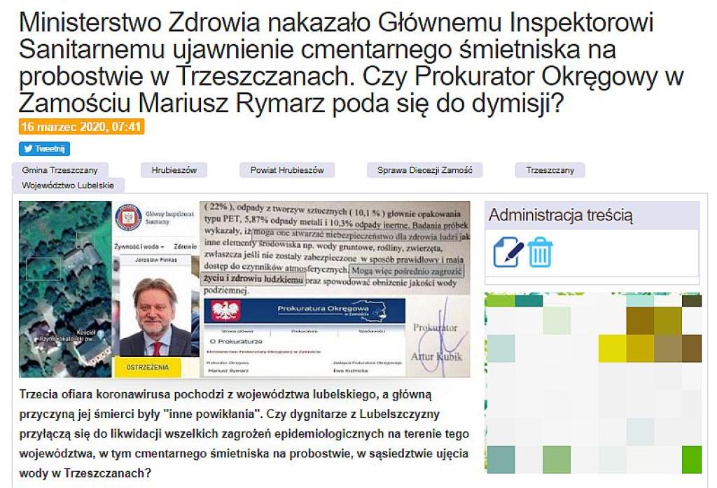 To skutek ujawnionej przez nas sprawy dot. zagrożenia dla zdrowia i życia poprzez utworzenie cmentarnego śmietniska na terenie probostwa w Trzeszczanach, w niedalekiej odległości od ujęcia wody pitnej.