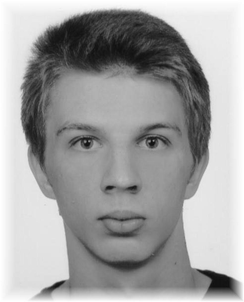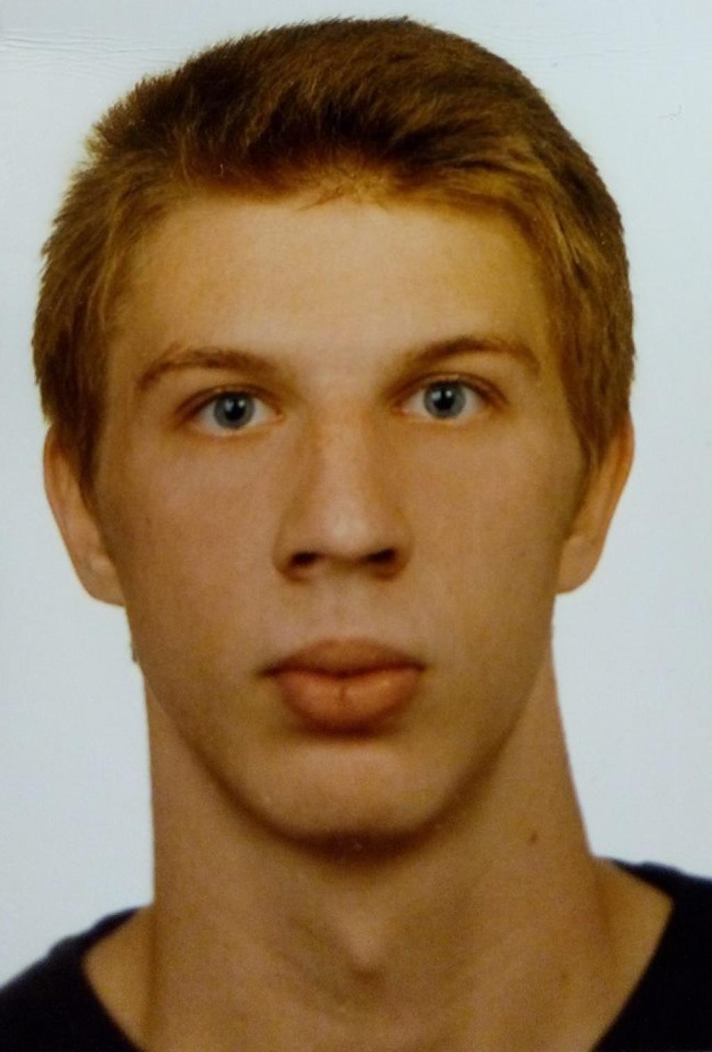 Wiek 19 lat, wzrost około 180 cm., waga 75 kg., szczupła budowa ciała, włosy krótkie proste ciemny brąz, twarz pociągła, nos normalny, oczy koloru niebieskiego, uzębienie pełne.