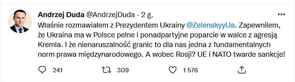 „W sytuacji, gdy Prezydent Rosji podważa porządek Europy ustanowiony na przełomie wieków (XX i XXI), potrzeba wielkiej jedności i zdecydowanej postawy NATO, UE i krajów naszego regionu. Tylko twarda postawa i polityczna obrona Ukrainy może zatrzymać agresora. Sankcje natychmiast!” – napisał w mediach społecznościowych Prezydent RP Andrzej Duda w odpowiedzi na decyzję Prezydenta Rosji.
