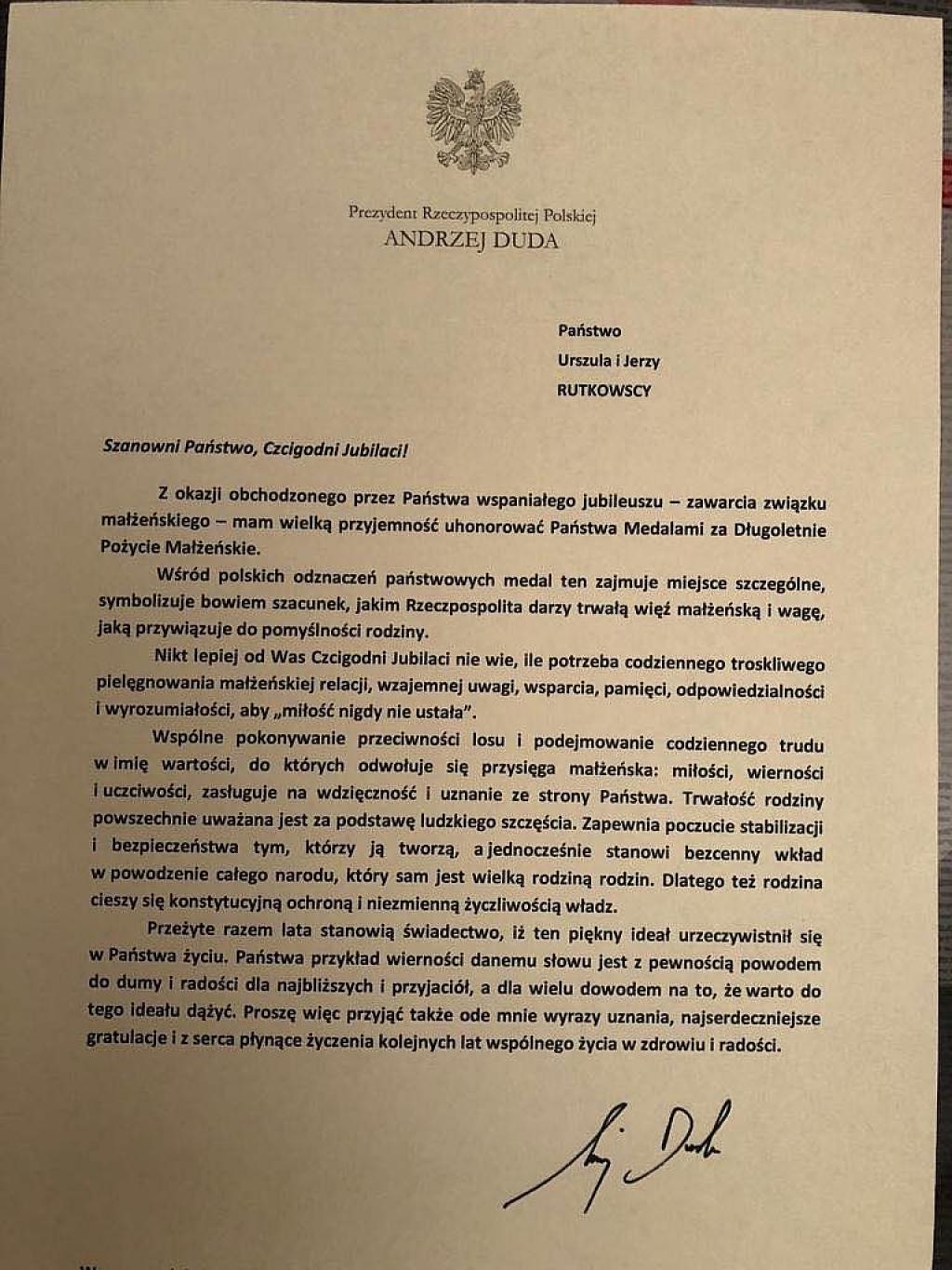 W tym roku wraz z mężem Jerzym obchodzili 60. rocznicę zawarcia związku małżeńskiego. Z tej okazji Prezydent Rzeczpospolitej Polskiej Andrzej Duda przyznał im medale oraz list gratulacyjny, który dołączamy do niniejszego tekstu.