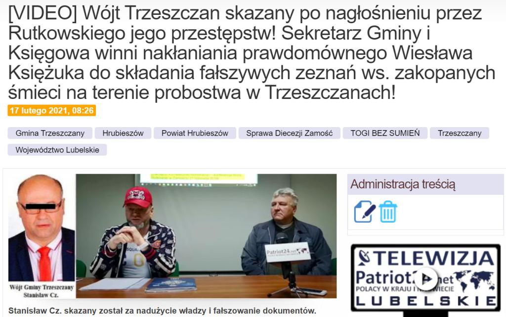 O pierwszym wyroku skazującym, który wymierzył mu Sąd Rejonowy w Hrubieszowie po naszych publikacjach i konferencji Krzysztofa Rutkowskiego, napisaliśmy rok temu. Chodzi o nakazanie robotnikowi Wiesławowi Księżukowi zakopania śmieci proboszcza Marka Barszczowskiego na terenie probostwa w Trzeszczanach. I nakazanie robotnikowi rozpisania tych prac jako „drogowe, gminne” co było oczywistą nieprawdą.