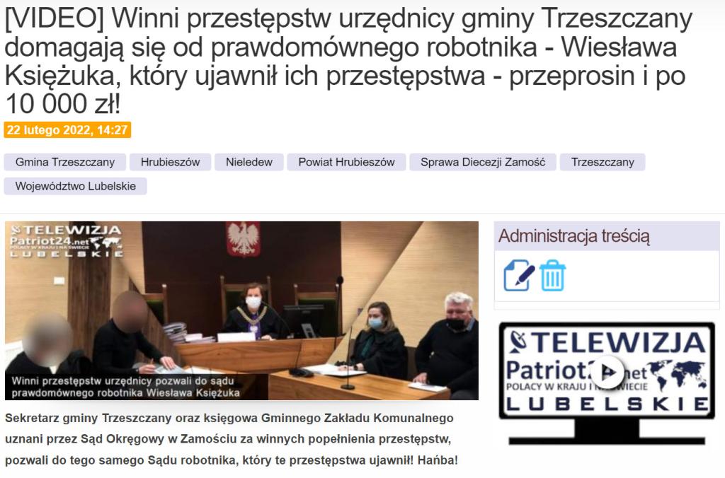 Przypomnijmy, że Sąd Okręgowy w Zamościu ze zdumiewającą szybkością wyznaczył rozprawę o ochronę dóbr osobistych, jakie wytoczyli uznani za winnych, ale też nie ukarani (sąd odstąpił od wymierzenia kary) sekretarz gminy Trzeszczany oraz główna księgowa. Oni zasiadali z wójtem razem na ławie oskarżonych w tym pierwszym procesie, bo prokurator oskarżył ich o namawianie Wiesława Księżuka do złożenia fałszywych zeznań, obiecując mu w zamian łapówkę w postaci przywrócenia do pracy i podwyżki z gminnej kasy!