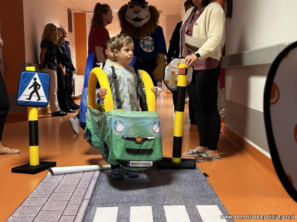Mundurowi przygotowali również symulację ulicy ze znakami drogowymi. Najmłodsi mogli przebrać się za autka i poruszać po animowanej jezdni, a inni prawidłowo przejść przez przejście dla pieszych. Zabawy było co niemiara. Dzieci były zachwycone, zwłaszcza możliwością dotknięcia i przymierzenia sprzętu policyjnego. Personel medyczny oraz rodzicie młodych pacjentów dzielnie kibicowali juniorom podczas całej tej akcji.