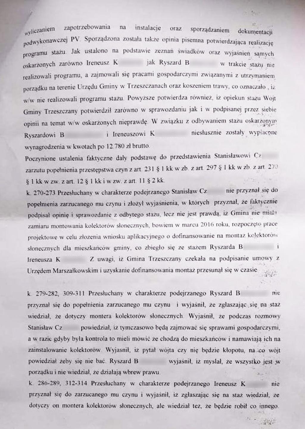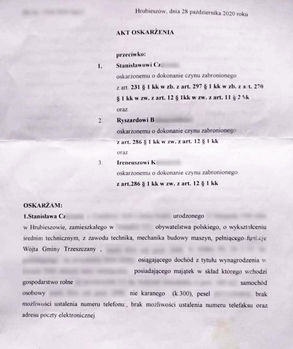 Dotyczy ona Stanisława Cz. z czasów, kiedy prowadził kampanię na rzecz wybrania go na stanowisko wójta w 2014 r. i możliwego jego przestępczego działania, jako ówczesnego gminnego operatora koparki, również na terenie probostwa w Trzeszczanach, za czasów proboszcza Grzegorza Hałasa.