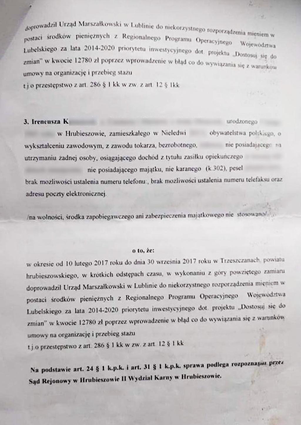 - Wiedzieliśmy, że to się nie zgadza z celem tego stażu. Ale wójt nas zapewniał, żebyśmy się nie martwili, bo on wszystko załatwi - czytamy w akcie oskarżenia relacje obu mężczyzn. Oni również zasiedli wczoraj na ławie oskarżonych Sądu Rejonowego w Hrubieszowie. Prokurator zarzuciła im, że wyłudzili po 12 780 zł każdy.