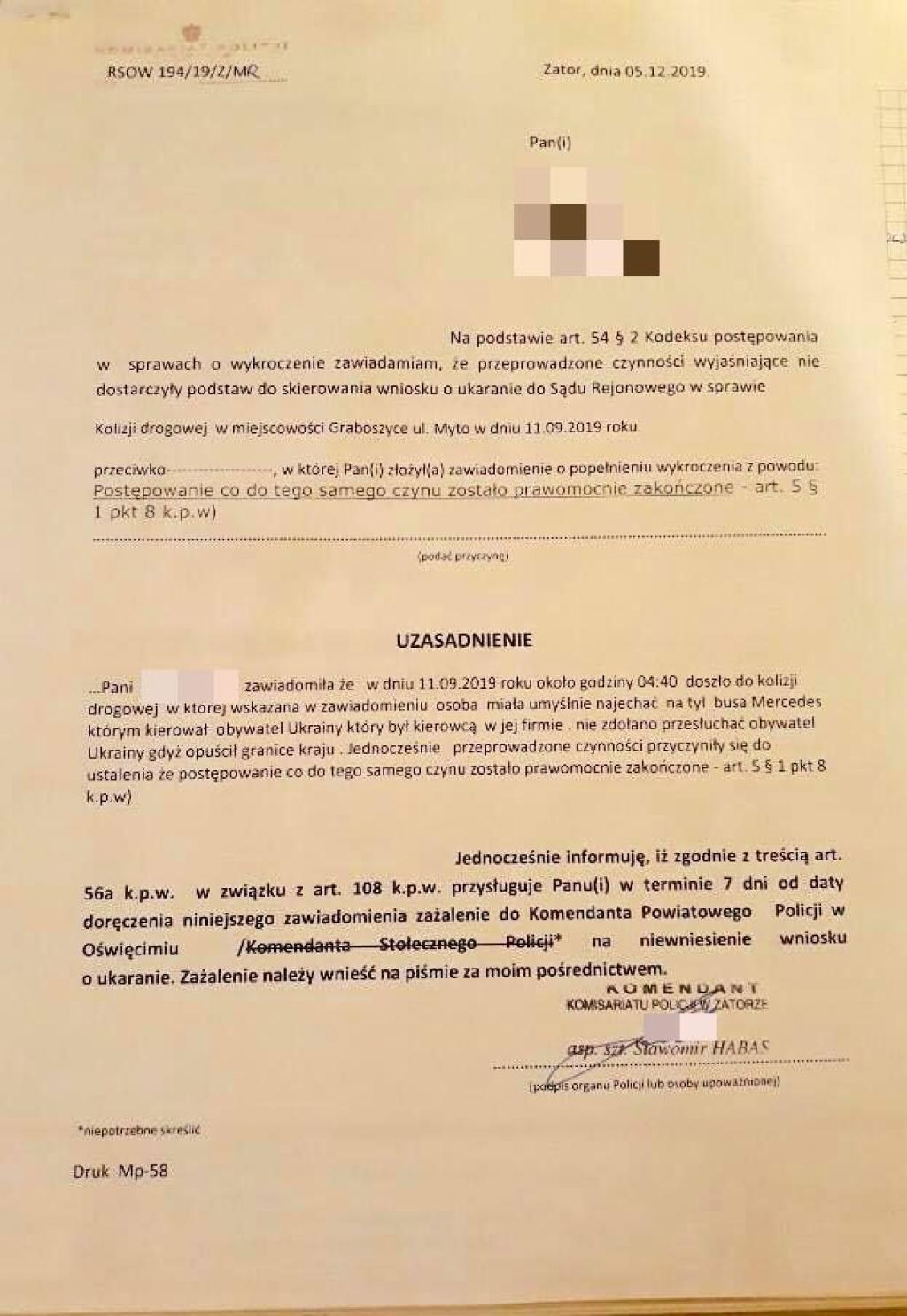 Tymczasem Policja nie potrafi dostrzec tego oszustwa, możliwego podrobienia dokumentów i wyłudzenia pieniędzy. Komendant Komisariatu Policji w miejscowości Zator Sławomir Habas nie widzi podstaw do ścigania tej sprawy. 5 grudnia 2019 wydał pismo, w którym twierdzi, że ustalanie czy doszło do sfingowania wypadku nie jest konieczne. To pismo również dołączamy do niniejszego tekstu.