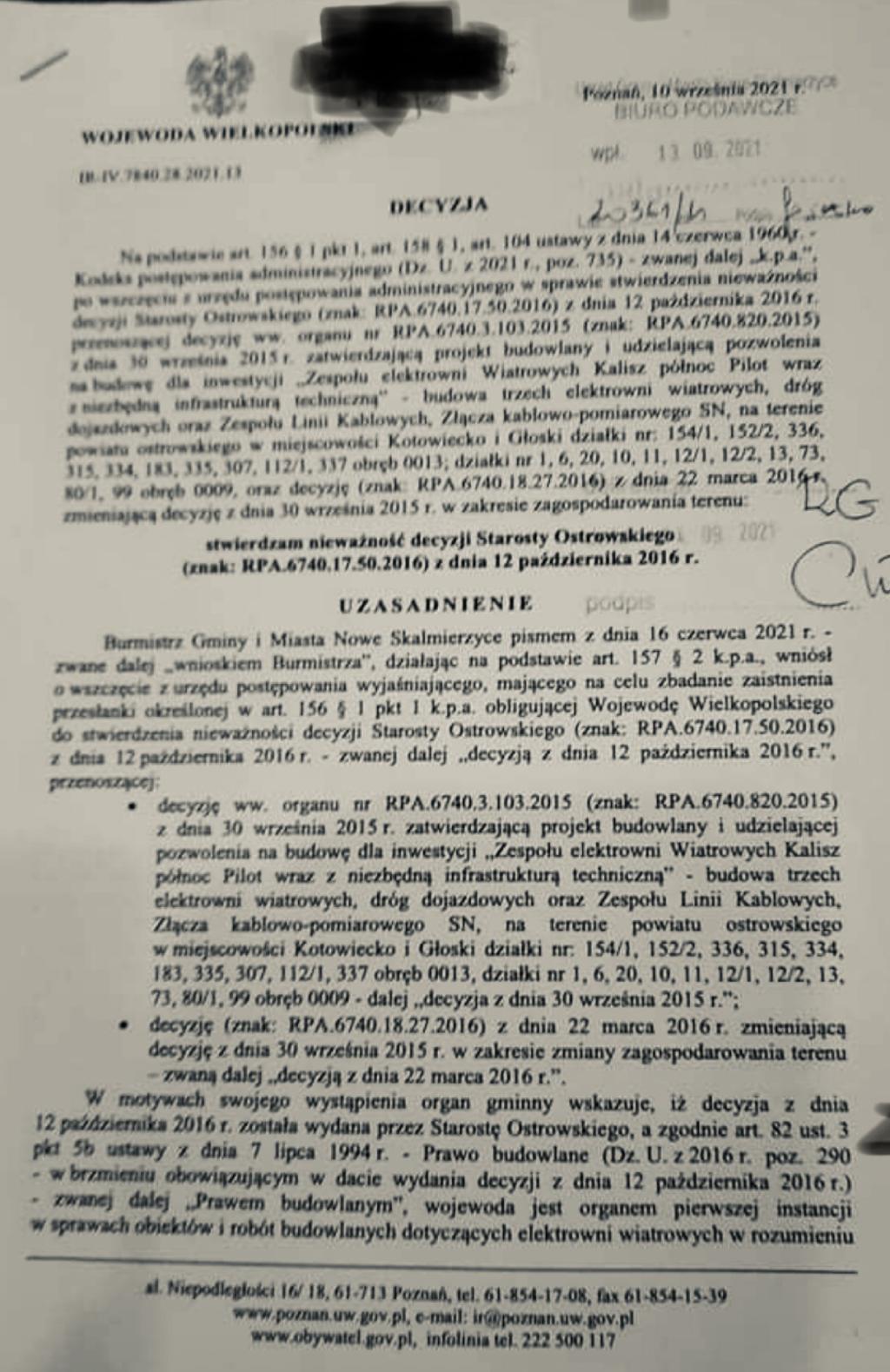 Prezentujemy 6-stronicową decyzję wojewody wielkopolskiego, który 10 września 2021 unieważnił pozwolenie na budowę 3 wiatraków w gminie Nowe Skalmierzyce, wydaną przez starostę Ostrowa Wielkopolskiego. Dziś adwokat "Stowarzyszenia Stop Wiatrakom" składa wnioski o ściganie kierownika tej budowy, Łukasza Grzesiuka, który ma za nic ustanowione przez wojewodę prawo!