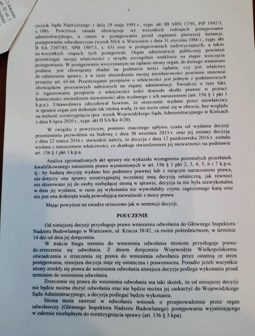 W „Decyzji” dołączonej do niniejszego tekstu czytamy, że starosta Ostrowa Wielkopolskiego nie miał żadnych kompetencji, by w 2016 r. wydać „Pozwolenia na budowę” obecnemu inwestorowi.