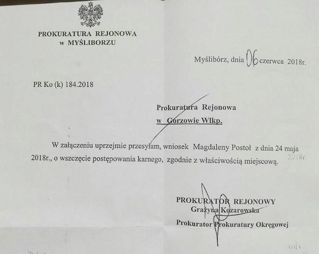 Magdalena Postoł otrzymała właśnie kopię polecenia Prokuratury Okręgowej w Gorzowie, która nakazuje podjęcie działań prokuratorskich względem adwokat w Prokuraturze Rejonowej w Gorzowie.