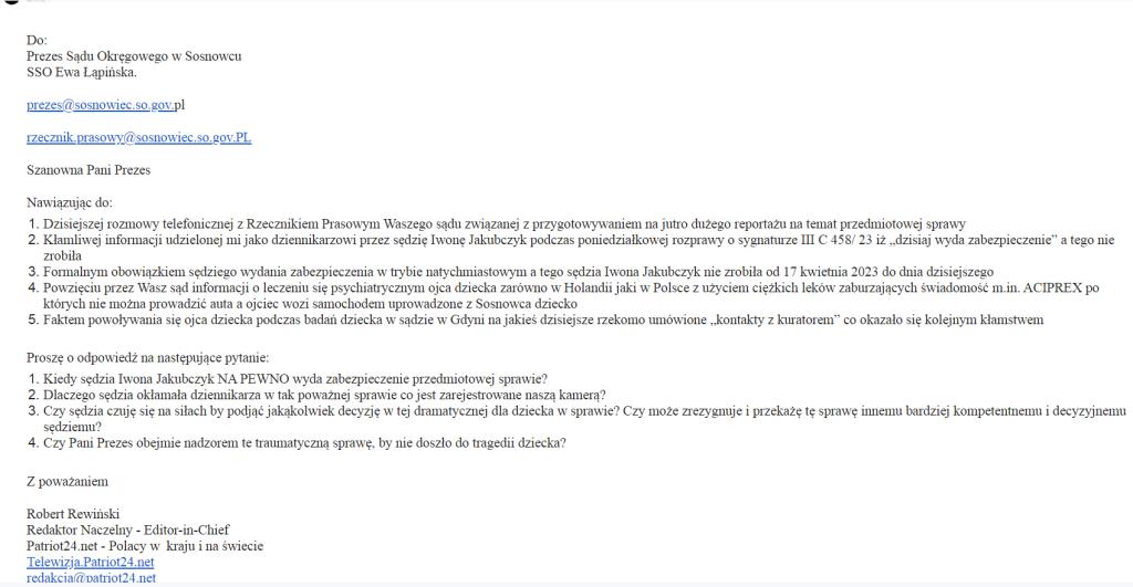Sąd Okręgowy w Sosnowcu zlekceważył apele Ministra Sprawiedliwości i Rzecznika Praw Dziecka po zabiciu 8-latka w Częstochowie, by w przypadkach „podejrzenia zagrożenia dla dziecka reagować natychmiast”. Mimo interwencji matki u wiceprezesa sądu, sędzia Iwona Jakubczyk od 17 kwietnia 2023 nie wydaje postanowienia o zabezpieczeniu miejsca pobytu dziecka i odkłada ten decyzję na nie wiadomo kiedy! Mimo że ma obowiązek wydać taką decyzję niezwłocznie!