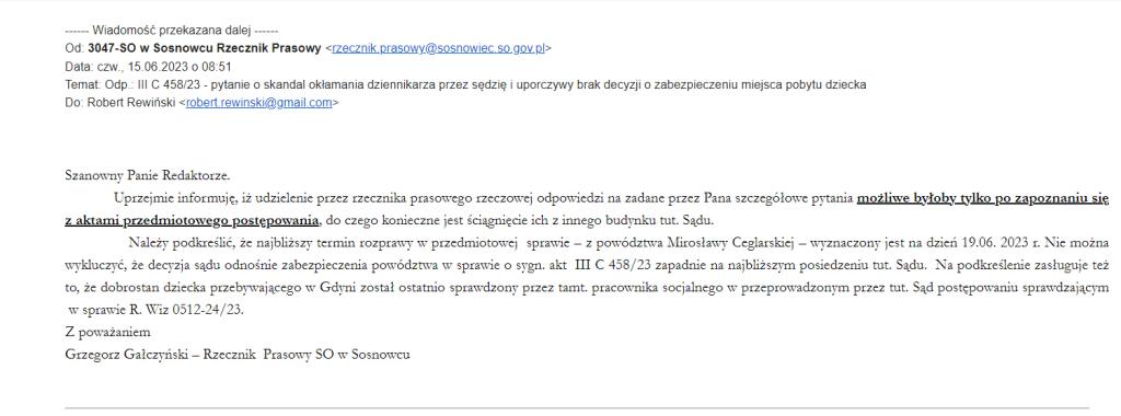 W dzisiejszym mailu Rzecznik prasowy Sądu Okręgowego w Sosnowcu informuję że najbliższe posiedzenie Sądu odbędzie się 19 czerwca 2023 r. Ale nie gwarantuje, że sędzia Iwona Jakubczyk wyda postanowienie w tej sprawie.